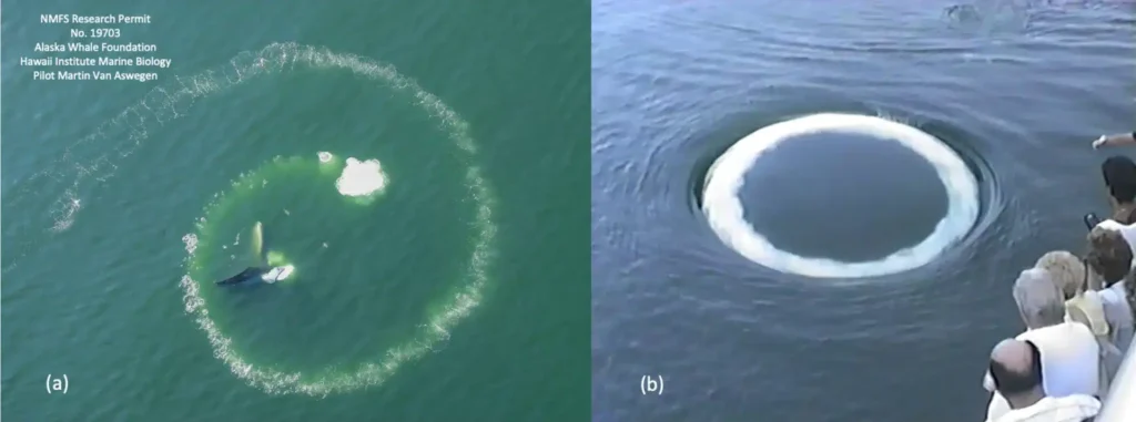 Historicamente, as jubartes são conhecidas por produzir bolhas para auxiliar na alimentação, criando barreiras que cercam cardumes de peixes. Em outros contextos, os machos também utilizam essas bolhas como forma de exibição em disputas territoriais durante a reprodução.
